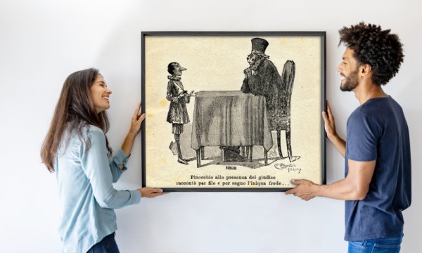 Pinocchio par Carlo Chiostri (1863-1939), un des premiers illustrateurs italiens de l'œuvre de Collodi (Carlo Lorenzini). Deux gendarmes prennent la marionnette en bois. L'image de gauche est le dessin original de Chiostri, celle de droite est la gravure