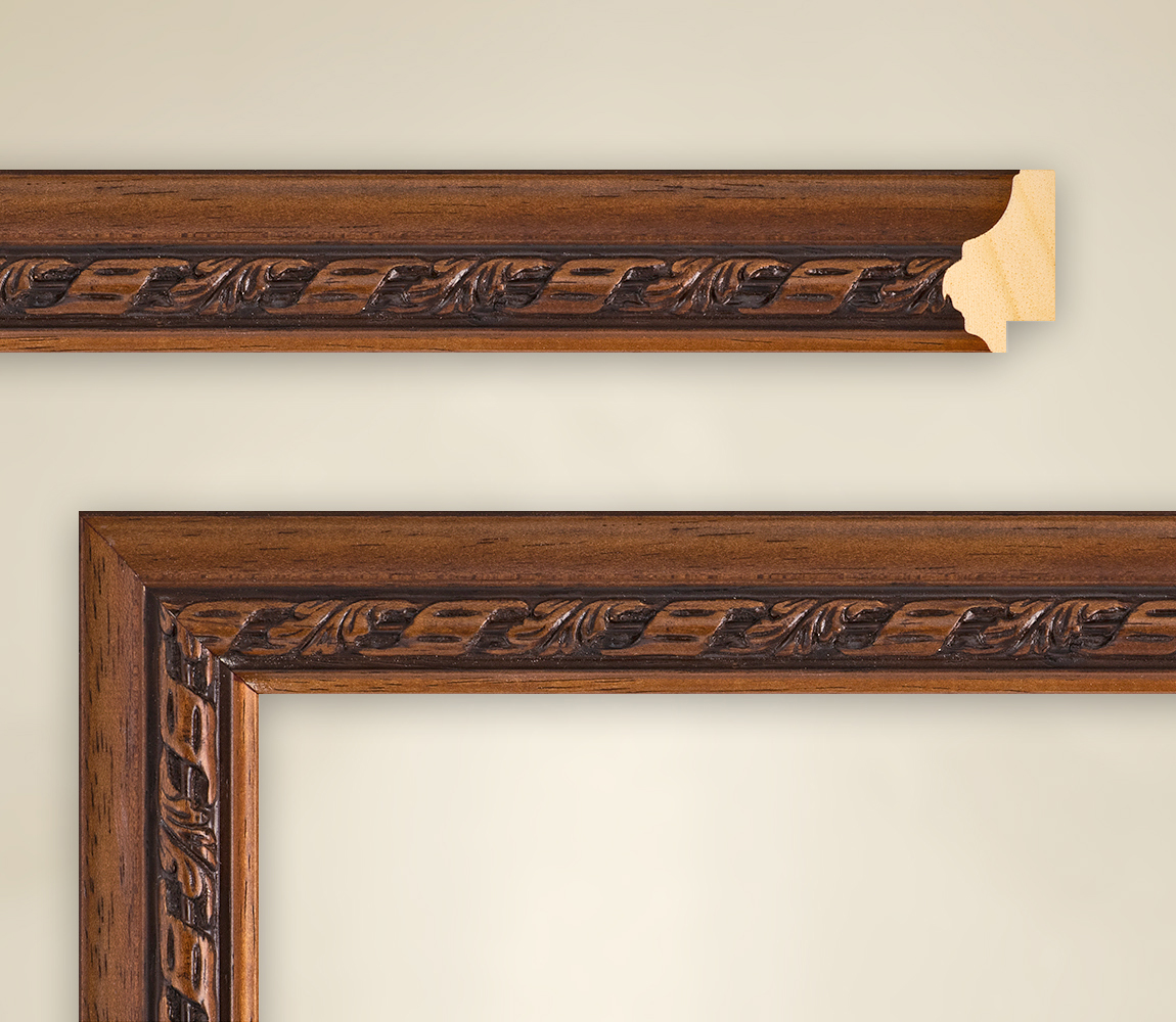 Les concepteurs ont conçu des sculptures individuelles pour le cadre de peinture Lucy. Dans la série Antiko, ce cadre en bois véritable est présenté dans un brun moyen chaud, mesure 34 mm de large et 22 mm de haut. En brun foncé, il commence par une barre très fine sur le cadre extérieur et est ensuite immédiatement remplacé par une barre large, lisse et incurvée. Des éléments sombres et fibreux ont été incorporés ici, de sorte que l'impression est créée comme si c'était le grain du bois de chêne. La barre ornementale qui suit est un ajout rustique convenable. La barre d'ornement se glisse dans la pièce comme une élévation maximale. Le fond des éléments décoratifs a été choisi en brun foncé, qui entoure également la bande au-dessus et en dessous d'une bande décorative. Cet ensemble offre un fort contraste avec les ornements eux-mêmes, qui à leur tour sont représentés dans le brun moyen de l'ensemble du cadre Lucy. Ces éléments décoratifs sont divisés en deux types, chacun alternant dans une disposition diagonale. D'une part, vous pouvez voir un travail floral sous la forme d'une vrille, d'autre part une structure rectangulaire qui rappelle un huit. Il n'y a pas de limites à l'imagination du spectateur - elles ont toujours un effet sur Lucy.