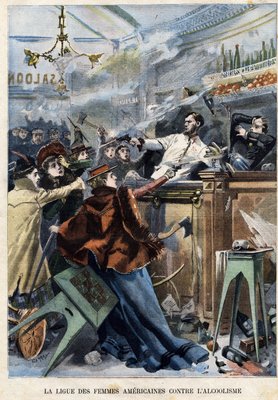 Affrontement dans un bar illustrant la lutte de l'American Women's League contre l'alcoolisme. Illustration du journal "Petite Parisien" en 1905.(A clash in a bar illustrating the American Women's League's struggle against alcoholism. Illustration of the newspaper "Petite Parisien" in 1905.)(after) Carrey |