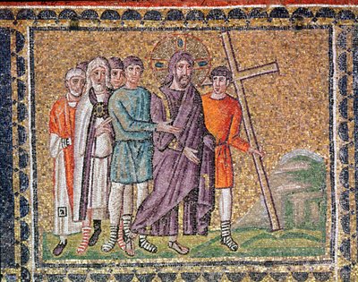 Le port de la croix. Le Christ, les soldats et les grands prêtres sur le chemin du Golgotha, VIe siècle (mosaïque)(The carrying of the Cross. Christ, soldiers and high Priests on the way to Golgatha, 6th century (mosaic))Byzantine School |