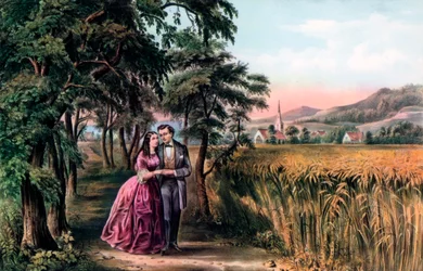 campagne · saison · champ · femelle · femmes · femme · les gens · mâle · jeune · homme · hommes · âge · été · amour · couples · jeunesse · maïs · blé · la vie · type · couleur · couleur · rustique · endroit · siècle · dame · concept · amoureux · 19ème siècle · cycle de vie · dix-neuvième siècle · rural · aging · currier and ives · currier ives · The Print Collector/Heritage Images