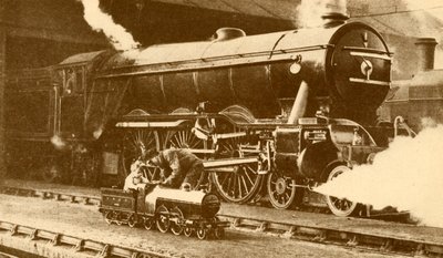Garçon chevauchant une locomotive à vapeur jouet devant la vraie locomotive (photo n/b)(Boy riding a toy steam locomotive in front of the real thing (b/w photo))English Photographer |
