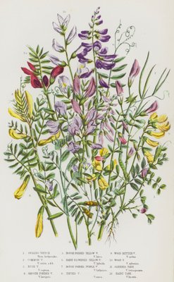 Plantes à fleurs de Grande-Bretagne : Vesce printanière, Vesce commune, Vesce buissonnante, Vesce à gousses lisses, Vesce jaune à gousses rugueuses, Vesce jaune à fleurs velues, Vesce pourpre à gousses rugueuses, Vesce touffue, Vesce amère des bois, Vesce(Flowering Plants of Great Britain: Spring Vetch, Common Vetch, Bush Vetch, Smooth-Podded Vetch, Rough-Podded Yellow Vetch, Hairy-Flowered Yellow Vetch, Rough-Podded Purple Vetch, Tufted Vetch, Wood Bitter Vetch, Wood Vetch, Slender Tare, Hairy Tare (colour)English School |