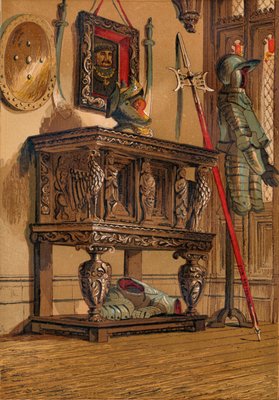 Buffet ou armoire élisabéthaine au château de Warwick (gravure en couleur)(Elizabethan sideboard or cupboard at Warwick Castle (coloured engraving))English School |
