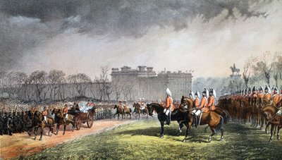 Hyde Park - La princesse passant les lignes des volontaires, 7 mars 1863, de A Memorial of the Marriage of Edward VII and Alexandra of Denmark, pub. 1864(Hyde Park - The Princess passing the lines of the volunteers, 7th March 1863, from A Memorial of the Marriage of Edward VII and Alexandra of Denmark, pub. 1864 )English School |