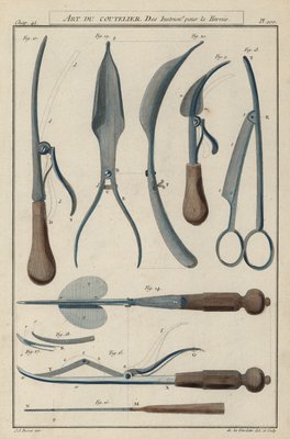 Instruments pour la chirurgie de la hernie(Instruments for hernia surgery (coloured engraving))European School |