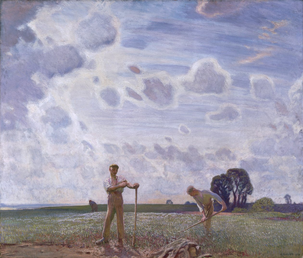 temps · dehors · ciel · saison · moisson · récolte · agriculture · champ · les gens · mâle · fonctionnement · travail · homme · hommes · affermage · été · peinture · ensoleillé · jour · type · couleur · couleur · nuageux · vastness · la chaleur · rustique · moisson · champs · siècle · effort · concept · deux personnes · mois · juillet · main de ferme · ouvrier de ferme · les années 10 · 20ème siècle · rural · landscape · george clausen · clausen · george · sir george clausen · national museum cardiff · kay kays · National Museum of Wales/Heritage-Images