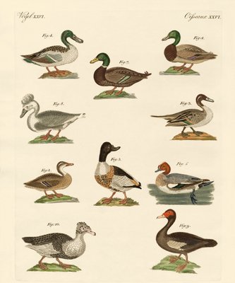 Beaux canards(Beautiful ducks (coloured engraving))German School |