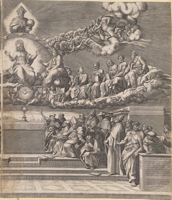 Discussion sur le Saint Sacrement(Diskussionen om det hellige Sakramente)Giorgio Ghisi,after Raphael(after),Hieronymus Cock(publisher) |