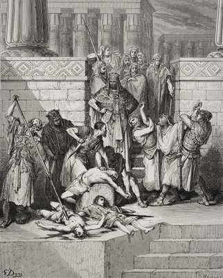 Abattage des fils de Sédécias devant leur père, II Rois 25:7, illustration tirée de 'La Sainte Bible' de Dore, gravée par Fournier(Slaughter of the Sons of Zedekiah before their Father, II Kings 25:7, illustration from Dore's 'The Holy Bible', engraved by Fournier)Gustave (after) Dore |