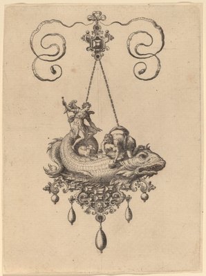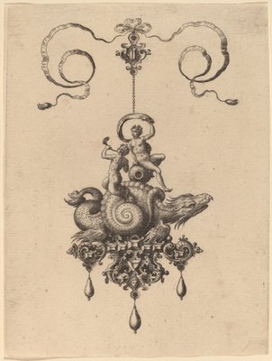 Conception pour un pendentif avec un monstre marin dans une coquille portant un triton et une femme avec une voile(Design for a Pendant with a Sea-Monster in a Shell Carrying a Triton and a Woman with a Sail)Hans Collaert the Elder |