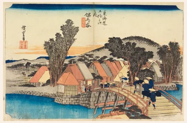 Hodogaya - Un village en bord de route avec une colline ronde au loin(Hodogaya - A wayside village with a rotund hill in the distance)Hiroshige |