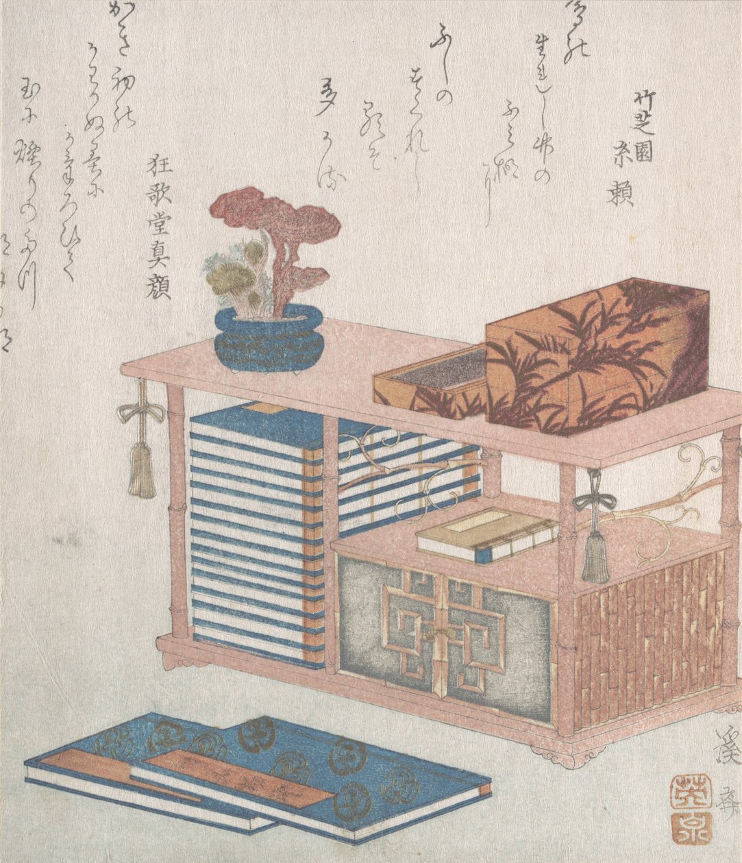 nature · usine · usines · arts · pays · livres · livre · musée · couleur · le japon · japonais · étagère · étagères · endroit · siècle · étagère · étagères · meubles · littérature · impression · bibliothèque · usine de pot · couleur · rencontré · usine mise en pot · 19ème siècle · dix-neuvième siècle · still life · ikeda eisen · eisen · ikeda · keisai eisen · heritage art · ink and color on paper · part of an album of woodblock prints surimono · eisen keisai · 19th-century · Heritage Art/Heritage Images