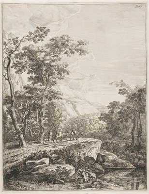 Paysage avec une femme chevauchant une mule le long de l'Aqua Negro entre Bologne et Florence(Landschap met vrouw rijdend op een muilezel langs de Aqua Negro tussen Bologna en Florence Italiaanse landschappen (series title))Jan Both(print maker),Jan Both(after own design by) |