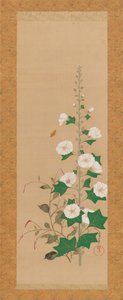 Vignes de Yugao et un poème, rouleau suspendu, XVIIIe-XIXe siècle(Yugao vines and a poem, Hanging scroll (mounted on panel), 18th-19th century (colour on paper))Japanese School |
