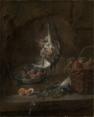 (Dead partridge hung by one leg, bowl with prunes and a basket with pears (painting on canvas))Jean-Baptiste Simeon Chardin |