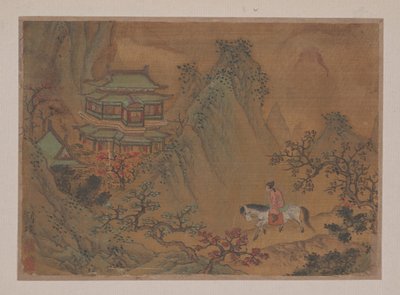 voyage · animal · bâtiment · bâtiments · les gens · mâle · homme · hommes · rouge · animaux · chevaux · cheval · maison · maisons · paysage · montagne · montagnes · pays · la chine · chinois · vert · type · musée · géographie · voyage · pavillon · ming · endroit · siècle · voyageurs · voyageur · à cheval · dynastie · dynastie de ming · une personne · montagne · couleur · rencontré · 16ème siècle · seizième siècle · landscape · ink and colour on silk · heritage art · ink and colour on silk · miniature from album of eleven paintings · miniature from album of eleven paintings · liu yen · liu · Heritage Art/Heritage Images