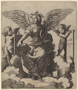 Femme avec livre et sceptre personnifiant la Philosophie, assise sur des nuages avec deux putti à ses côtés(Vrouw met boek en scepter als personificatie van Filosofie zittend op wolken en voeten rustend op globe met naast haar twee putti)Marcantonio Raimondi(print maker),Rafaël(after design by) |