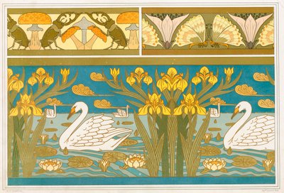 iris · cygnes · papillon · antlers · toadstool · mycètes · champignons · waterlily · art nouveau · coléoptère de mâle · historica graphica collection · colour lithograph · papillons · illustration · animals in decoration · l'animal dans la decoration · maurice pillard verneuil · maurice pillard verneuil 1869?1942 · bordure · lucanes · champignons oxalides · cygnes · nénuphars · email cloisonne · butterlfies · wood sorrel flower · Historica Graphica Collection/Heritage Images