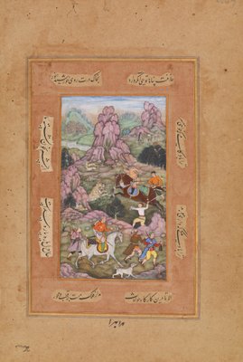 Khosrow et Shirin chassant les lions, c.1580(Khosrow and Shirin hunting lions, c.1580 (opaque wc on paper))Persian School |