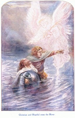 Christian et Hopeful traversent la rivière (lithographie couleur)(Christian and Hopeful cross the River (colour litho))Robert Ambrose (after) Dudley |