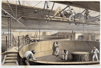Enroulement du câble télégraphique dans les cuves de l'usine de Greenwich, extrait de "The Atlantic Telegraph" de William Howard Russell, publié en 1866 (lithographie couleur) (voir aussi 192775-779)(Coiling the telegraph cable in the tanks at the works in Greenwich, from 'The Atlantic Telegraph' by William Howard Russell, published 1866 (colour litho) (see also 192775-779)Robert Dudley |