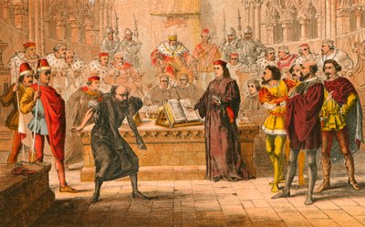 Shylock parle dans Le Marchand de Venise, acte IV, scène I, "Is that the law ", tiré de "The Illustrated Library Shakespeare", publié à Londres en 1890 (lithographie en couleur).(Shylock speaks in The Merchant of Venice, Act IV, Scene I, 'Is that the law?', from 'The Illustrated Library Shakespeare', published London 1890 (colour litho))Robert Dudley |