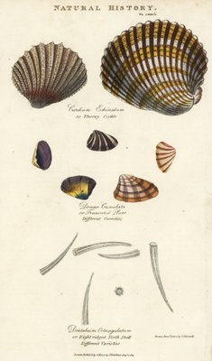 | Coquille épineuse, Cardium echinatum, purr tronqué, Donax crenulata, et coquille à huit crêtes, Dentalium octangulatum(Thorny cockle, Cardium echinatum, truncated purr, Donax crenulata, and eight-ridged tooth shell, Dentalium octangulatum. Handcoloured copperplate engraving after Sydenham Edwards from John Mason Good's Pantologia, a New Encyclopedia, G. Kearsley, London)Sydenham Teast Edwards |
