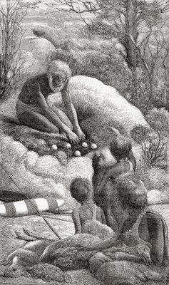 Des aborigènes australiens examinent le nid d'un mégapode.(Australian aborigines examine the nest of a megapode.)Unbekannt |