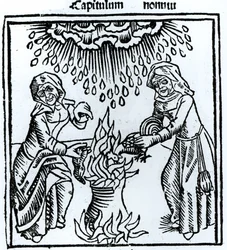temps · femelle · femmes · femme · les gens · le feu · pluie · goutte de pluie · médiéval · siècle · magie · dame · supernatural · sorcière · monochrome · occulte · charme · sorcellerie · occultisme · noir et blanc · noir et blanc · médiéval · Âges moyens · ann ronan pictures · unknown · Ann Ronan Picture Library/Heritage-Images