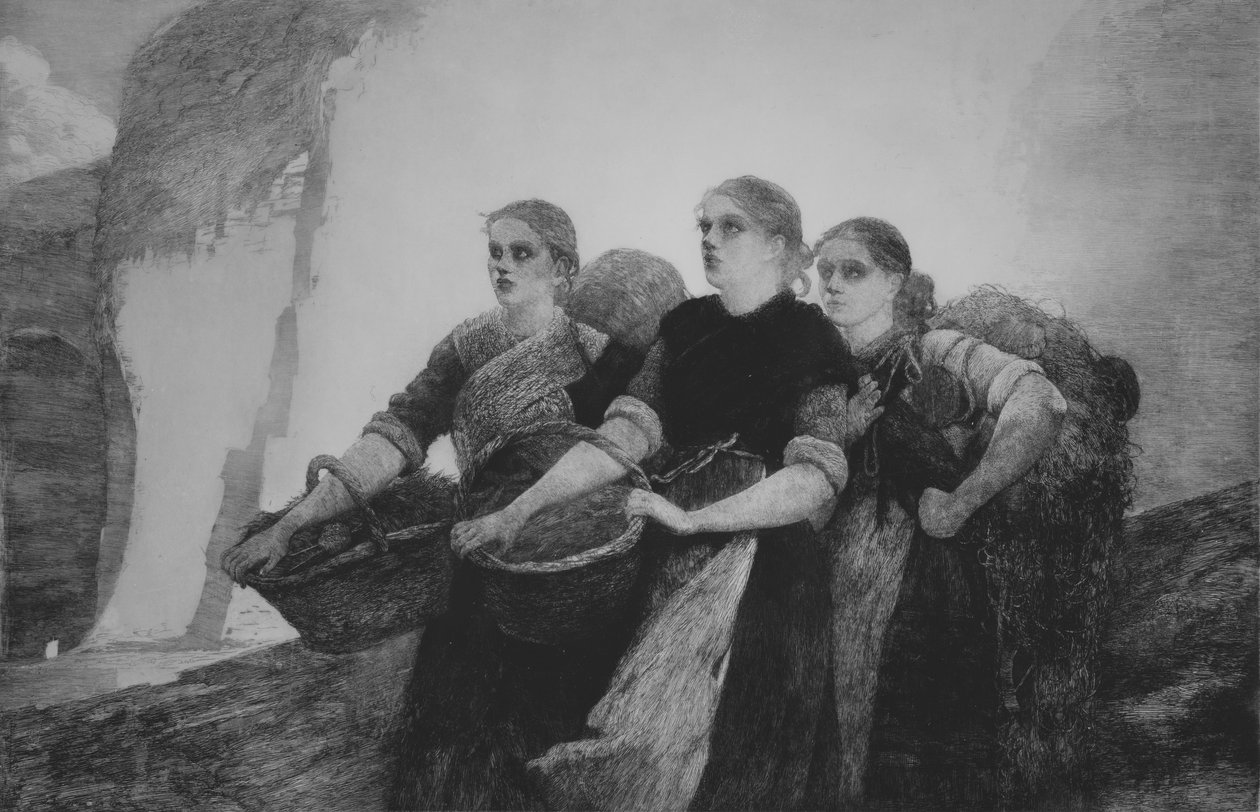 femelle · femmes · femme · les gens · bruit · pays · pêche · écoute · panier · paniers · musée · géographie · falaise · falaises · spooky · eerie · endroit · siècle · fisherwoman · fisherwomen · concept · rencontré · 19ème siècle · noir et blanc · noir et blanc · dix-neuvième siècle · américain · les etats-unis · etching · winslow homer · homer · winslow · fisherfolk · heritage art · Heritage Art/Heritage Images |